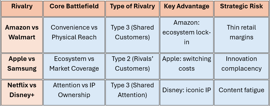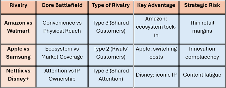 Competitive Rivalry in Action: Amazon vs Walmart, Apple vs Samsung, Netflix vs Disney+