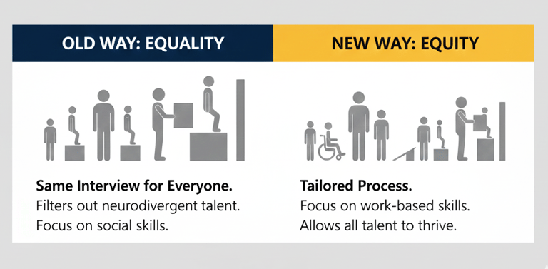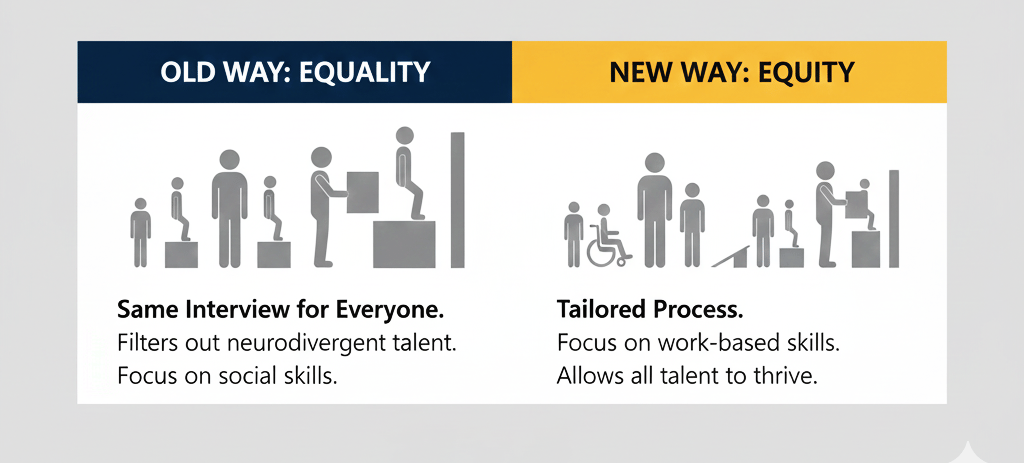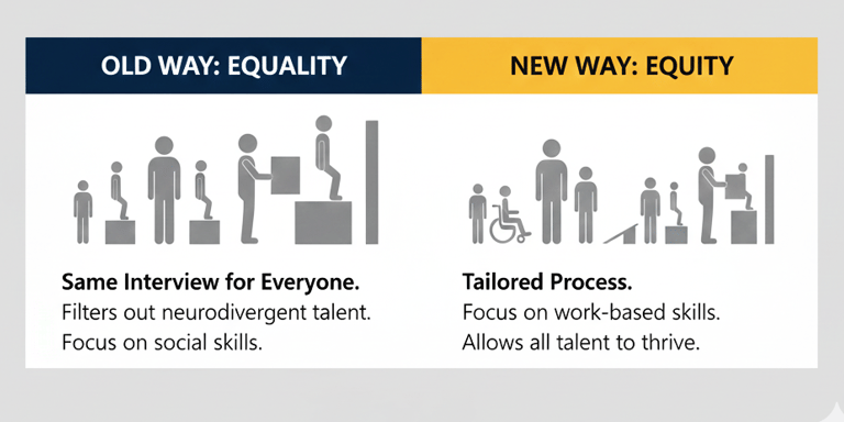 Microsoft realized that "Equality" (giving every candidate the exact same 60-minute interview) was actually unfair to neurodivergent talent. They shifted toward Equity by redesigning the process:
