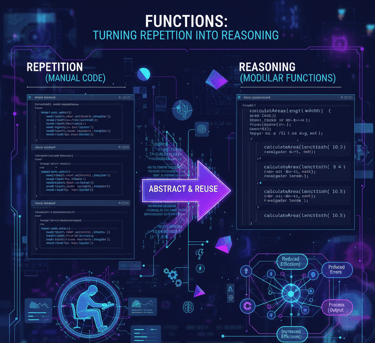 As programs grow beyond a few lines, the question shifts from “Can this run?” to “Can this scale, adapt, and be understood?” Functions are the answer to that question. In programming, a function is a named sequence of statements that performs a specific task. Conceptually, functions allow us to bundle logic, give it meaning, and reuse it, much like standardized processes in business or reusable models in analytics.