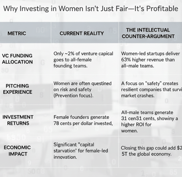 The "Prevention" Bias: During pitches, men are often asked how they will win (growth), while women are asked how they will not lose (risk). This bias in questioning directly leads to lower funding, despite the better performance metrics of female-led firms.