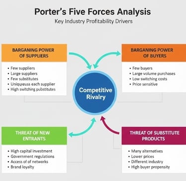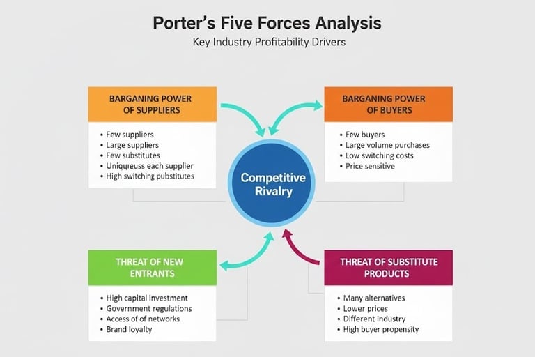 Porter’s Five Forces framework is a valuable tool for assessing the competitive dynamics within an industry. It is particularly beneficial for entrepreneurs considering launching a new business or entering a different sector. This model posits that competition is influenced by five key forces: the threat of new entrants, the bargaining power of suppliers, the bargaining power of buyers, the threat of substitute products or services, and the intensity of rivalry among existing firms. The interplay of these forces shapes the profit potential of an industry, affecting its overall attractiveness. In scenarios where these forces are strong, such as in the airline industry, companies often struggle to achieve favorable returns on their investments. Conversely, in industries with weaker forces, like the soft drink sector, there tends to be greater opportunity for higher returns.